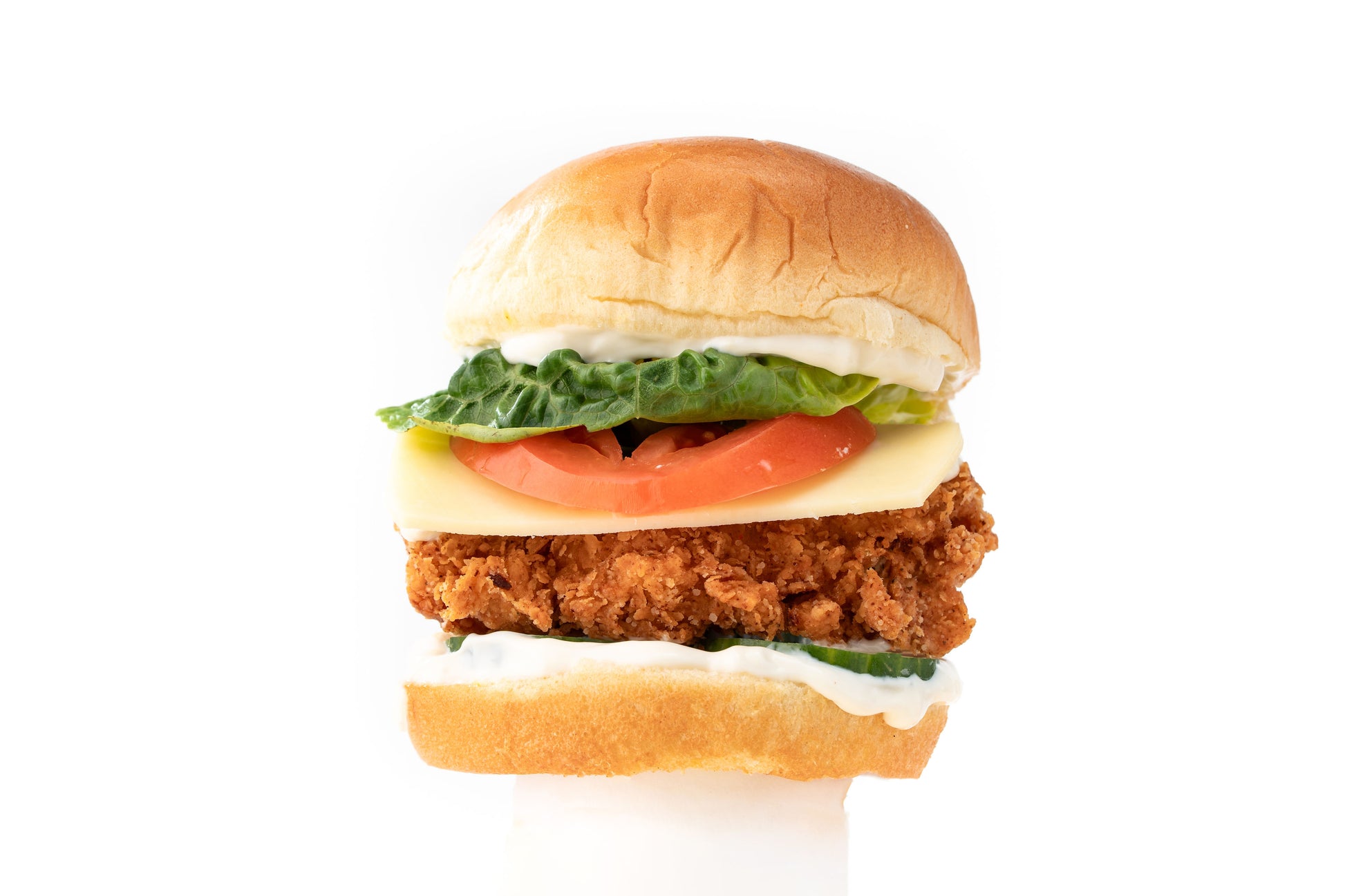 Golden crispy chicken breast, melted cheese, crisp lettuce, tangy pickles and creamy mayo in a soft brioche bun.